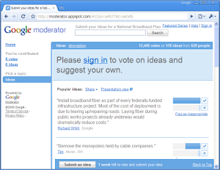 for what you think the Commission should include in its National Broadband Plan. Two weeks from now we'll take the most popular and most innovative ideas and submit them to the official record at the FCC on your behalf.If you are interested, go submit your idea or cast your vote. You have less than 2 weeks to act.